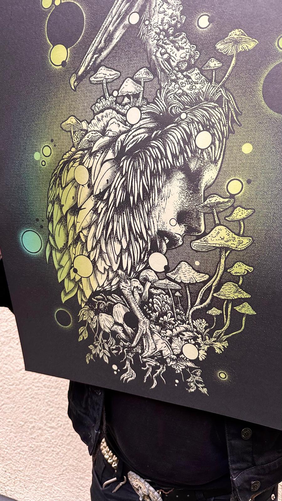Three colors split fountain screen print on black 300 g/m² paper in the format 50 x 70 cm in a one-time edition of 42 copies.